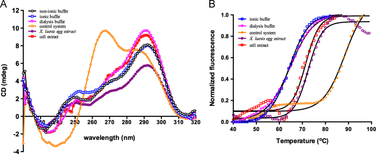 Fig. 2. (A), CD spectra of 5 μM HTG21 oligomer in non-ionic buffer (10 mM Tris–HCl buffer, pH 7.4), ionic buffer [10 mM Tris–HCl buffer (pH 7.4) containing 110 mM KCl], dialysis buffer, control system (dialysis buffer with 40% PEG), Xenopus laevis egg extract, and cell-free system (dialysis buffer with cell extract). (B), The FRET melting curves of HTG21G-quadruplex in ionic buffer, dialysis buffer, cell-free system, X. laevis egg extract, and control system.