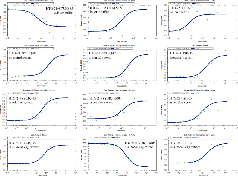 Fig. 5. Fitted curves obtained by MST measurements of 5’-FAM-labeled HTG-21 with ligands diluted 1:2 from 20 μM for 14 times.