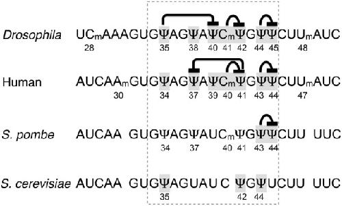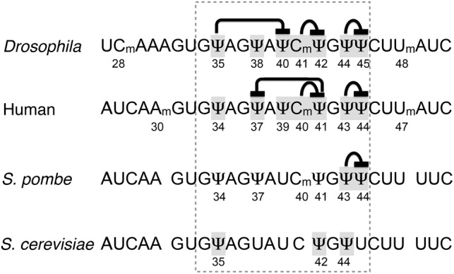 FIGURE 1. Post-transcriptional modification at the branch point recognition region of U2 snRNA from different species. The recognition region is highlighted with a dashed line. Positions examined in this and previous studies are shadowed. Proposed interactions between the tested positions are indicated.
