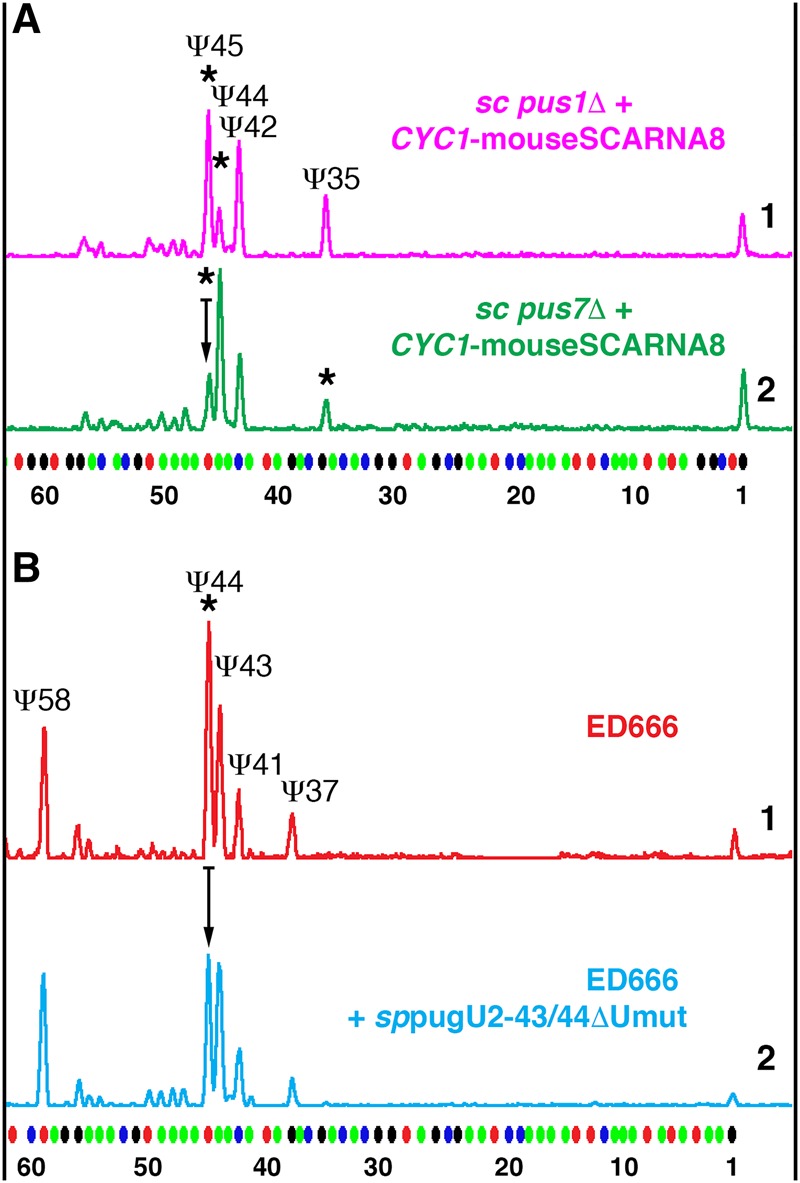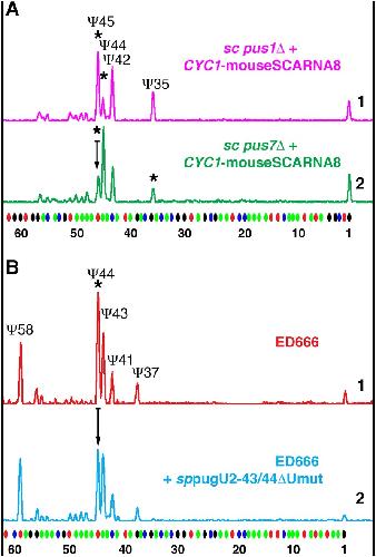 FIGURE 6. Prior pseudouridylation of U2 snRNA at position 43 inhibits positioning of Ψ44 by mouse SCARNA8 and S. pombe pugU2-43/44, SPNCRNA.1709. Fluorescent primer extension reactions. (A) Mouse SCARNA8 was expressed in the S. cerevisiae strains pus1Δ (top magenta trace) and pus7Δ (bottom green trace) from a plasmid with a weak CYC1 promoter that allowed prior modification of position 44 in yeast U2 snRNA by endogenous Pus1p. In the pus7Δ strain, modification of position 45 was reduced relative to that in the pus1Δ strain (arrow shows reduction in peak height). Stars indicate SCARNA8-induced pseudouridylation. Modification of position 35 in the pus7Δ strain served as an internal positive control. (B) Top trace (red): Pseudouridylation pattern of U2 snRNA in wild-type S. pombe (strain ED666). Bottom trace (blue): Overexpression of pugU2-43/44ΔUmut RNA caused reduction of pseudouridylation at position 44 (arrow shows reduction in peak height).