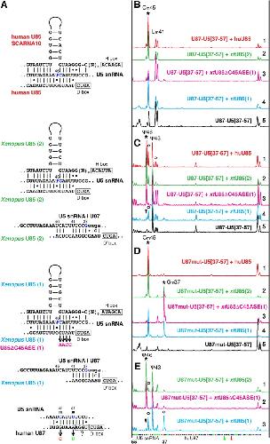 FIGURE 8. U85 scaRNA modification activity on U5 snRNA. (A) Predicted interactions of human U85, Xenopus U85, and human U87 scaRNAs with U5 snRNA. Targeted positions are shown in blue. Mutations introduced in antisense elements of Xenopus U85 and human U87 RNAs are color-coded to match colors used in B–E. (B–E) Fluorescent primer extension reactions. (B,D) 2′-O-methylation and (C,E) pseudouridylation of the 5′ loop of vertebrate U5 snRNA (nucleotides 37–57) inserted into U87 RNA and expressed in wild-type yeast cells. Stars indicate peaks that correspond to modifications induced by human U85 (traces 1, red in B–D) and two Xenopus wild-type U85 (traces 2, green and 4, blue in B–D; traces 1, 3 in E), and Xenopus U85 with mutated Cm45 antisense element, U85ΔC45ASE (traces 3, magenta in B–D; trace 2 in E). Arrowheads point to missing Ψ46. Trace 5, black in B, C, and D: Control samples of U87–U5 substrate RNAs expressed alone in yeast cells. In the tested artificial U5 snRNA substrate, U87–U5[37–57], position 43 is pseudouridylated by an unknown endogenous yeast snoRNA (C,E) and positions 41 and 45 are 2′-O-methylated by U87 RNA itself (B). (D) When the antisense element for positioning Um41 and Cm45 was removed from U87, U87mut-U5[37–57], an additional position became 2′-O-methylated by Xenopus U85; human U85 could not induce this modification. Open circles in C and E indicate stops at 2′-O-methylated positions. In the interest of space, only three Xenopus U85 traces are shown in E; the pattern induced by human U85 (not shown) is very similar to that in trace 1 (green) of Xenopus U85(2); the control U87mut-U5[37–57] alone (not shown) looks as expected, with one peak at Ψ43 and no extra peak at Um41. The sequence of U87–U5 substrate RNA and mutated positions are shown at the bottom of E.