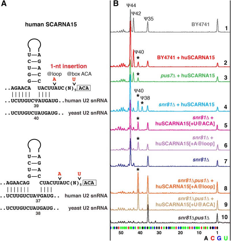 FIGURE 2. Pseudouridylation of yeast U2 snRNA induced by human SCARNA15. (A) Predicted base-pairing of huSCARNA15 with human and yeast U2 snRNA. Point mutations introduced into huSCARNA15 are shown in red. (B) Mapping of pseudouridines by fluorescent primer extension reactions. Top (gray) trace: Wild-type S. cerevisiae (BY4741) U2 snRNA is normally modified at positions 44, 42, and 35. Traces 2 (red) and 3 (green): When huSCARNA15 was expressed in the wild-type (red) or mutant pus7Δ strains (green), position 40 became pseudouridylated, as indicated by the star. Trace 4 (light blue): In the snr81Δ strain, huSCARNA15 induces pseudouridylation of positions 40 and 38 (stars). Traces 5 (magenta) and 6 (violet): 1-nt insertions between the box ACA and the upper stem (+U@ACA, or +A@loop) eliminate modification at position 38. Trace 7 (blue): Control snr81Δ strain without exogenous guide RNA. Traces 8–10: When expressed in the snr81Δpus1Δ mutant strain, the mutated RNAs produce only Ψ40 (star).