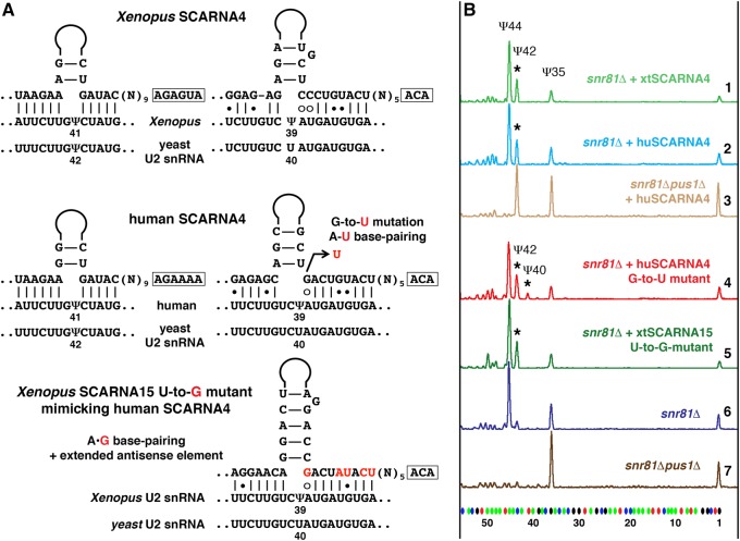 FIGURE 4. Pseudouridylation of yeast U2 snRNA induced by Xenopus and human SCARNA4. (A) Predicted base-pairing of SCARNA4 with vertebrate and yeast U2 snRNA. A point mutation in human SCARNA4 that converts the A–G mismatch into a canonical A–U base pair is shown in red. A mutated Xenopus SCARNA15 that mimics base-pairing of human SCARNA4 with U2 snRNA is also shown; mutated positions are highlighted in red. (B) Fluorescent primer extension reactions. Traces 1 (green), 2 (blue), and 3 (pale brown): Xenopus and human SCARNA4 rescue yeast U2 snRNA pseudouridylation at position 42 (star) in the snr81Δ and snr81Δpus1Δ mutant strains. Trace 4 (red): Human SCARNA4 shows no activity on position 40 unless G in the 3′-terminal pocket is mutated to U. Trace 5 (dark green): A–G base-pairing within the 3′ terminal pseudouridylation pocket of the mutated Xenopus SCARNA15 makes the 3′-terminal domain nonfunctional on yeast U2 snRNA. Note absence of Ψ40. Traces 6 (dark blue) and 7 (brown): Controls without exogenous RNAs.