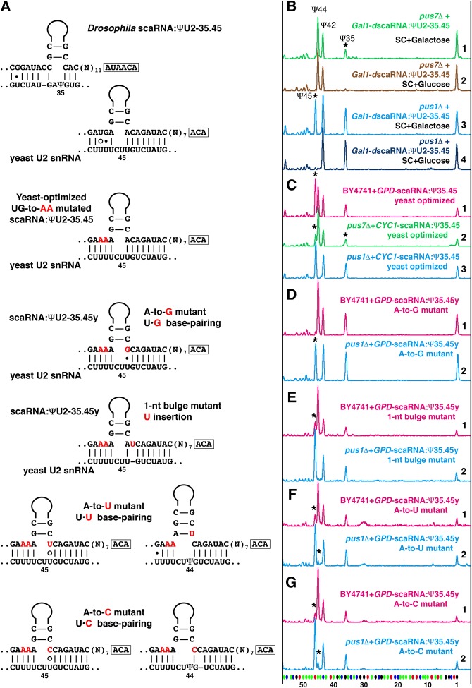 FIGURE 5. Pseudouridylation of U2 snRNA at position 44 interferes with pseudouridylation at position 45 in the yeast cell system. (A) Base-pairing of wild-type and mutated variants of Drosophila scaRNA:ΨU2-35.45 with yeast U2 snRNA. Mutated nucleotides are shown in red. (B–G) Fluorescent primer extension reactions. (B) Traces 1 (green) and 2 (light brown): Drosophila scaRNA:ΨU2-35.45 cannot induce pseudouridylation at position 45 when expressed stepwise from an inducible Gal promoter in the pus7Δ yeast strain. Rescue of pseudouridylation at position 35 (star) serves as an internal positive control. Traces 3 (blue) and 4 (dark blue): In the same experimental setup, Drosophila scaRNA:ΨU2-35.45 is active at position 45 (star) in the pus1Δ strain, which has no Ψ44 in U2 snRNA. (C) Trace 1 (magenta): scaRNA:ΨU2-35.45 optimized for positioning Ψ45 in yeast U2 snRNA efficiently modifies position 45 in wild-type yeast strain only when overexpressed. Trace 2 (green): The same yeast-optimized RNA modifies position 45 inefficiently in Pus1p-positive strains, such as pus7Δ. Trace 3 (blue): This RNA is fully functional at position 45 in the pus1Δ strain. (D–G) Traces 1 (magenta): Point mutations in the 3′ side of the yeast-optimized U2-Ψ45 pseudouridylation pocket affect the corresponding modification activity, especially in the presence of U2-Ψ44 in a “wild-type” yeast strain. Traces 2 (blue): The U2-Ψ45 modification activity is evident in the absence of U2-Ψ44 in the pus1Δ yeast strain. Stars indicate guide RNA-induced pseudouridines.