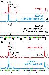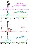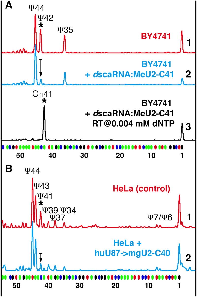 FIGURE 7. Prior 2′-O-methylation of a position in the branch point recognition region inhibits pseudouridylation of the following position. Fluorescent primer extension reactions. (A) Trace 3 (black): Expression of Drosophila scaRNA:MeU2-C41 in the wild-type S. cerevisiae strain BY4741 results in 2′-O-methylation of yeast U2 snRNA at position 41. Traces 1 (red) and 2 (blue): Methylation at position 41 results in dramatic reduction of pseudouridylation at position 42 (trace 2) relative to control (trace 1). (B) Traces 1 (red) and 2 (blue): In HeLa cells, overexpression of the methylation guide RNA for position C40 of U2 snRNA (trace 2) leads to a lower level of U2 snRNA pseudouridylation at position 41 than in control cells transfected with an empty vector (trace 1). The arrow in trace 2 shows reduction in peak height.
