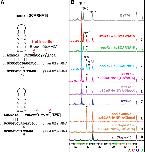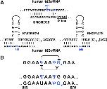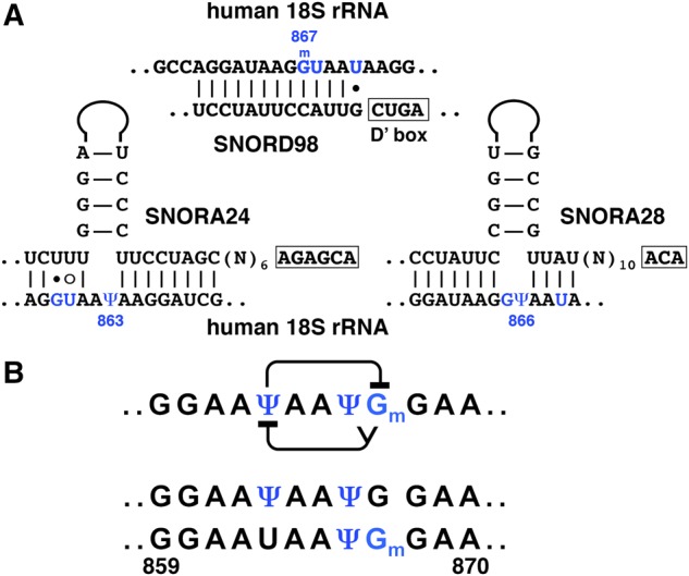 FIGURE 9. Interactions within a heavily modified region of human 18S rRNA. (A) Base-pairing between human 18S rRNA and guide RNAs SNORA24, SNORA28, and SNORD98 assigned for modification of positions 863, 866, and 867, respectively. (B) Predicted interference between Ψ863, Ψ866, and Gm867 (top row) and differentially modified fragments (second and third rows) experimentally detected by classical biochemical techniques (Maden and Wakeman 1988). Modified positions are colored in blue.