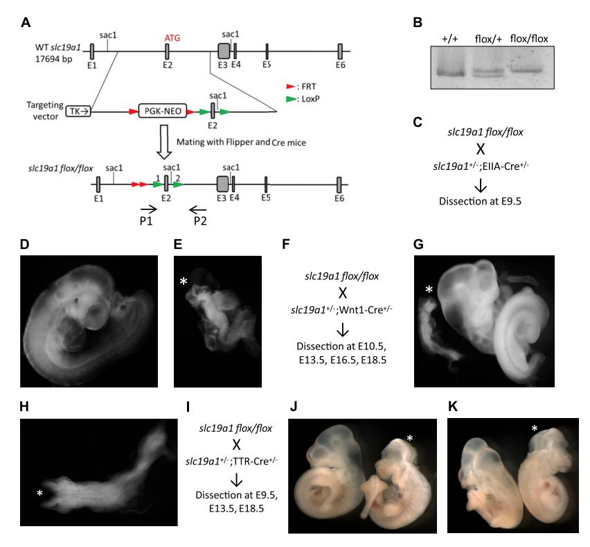 embryo; asterisk: open neural tube. I ) Scheme of crossbreeding. Slc19a1 flox/flox mice were crossed with slc19a1+/2;Ttr-Cre+/2