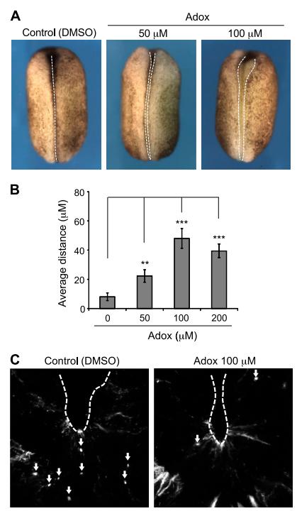 and 39.5 6 4.67 mm (n = 31) in 50, 100, and 200 mM adoxtreated embryos, respectively. Mean values with bars representing SEM are shown. **P , 0.01, ***P , 0.001 (Studentâs t test).