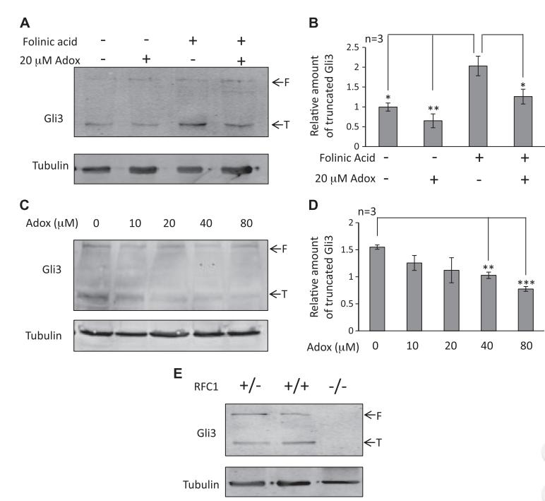 Figure 4. Folate regulates Shh signaling via methylation pathway. A) Western blot analysis for Gli3 (top band; full-length Gli3,