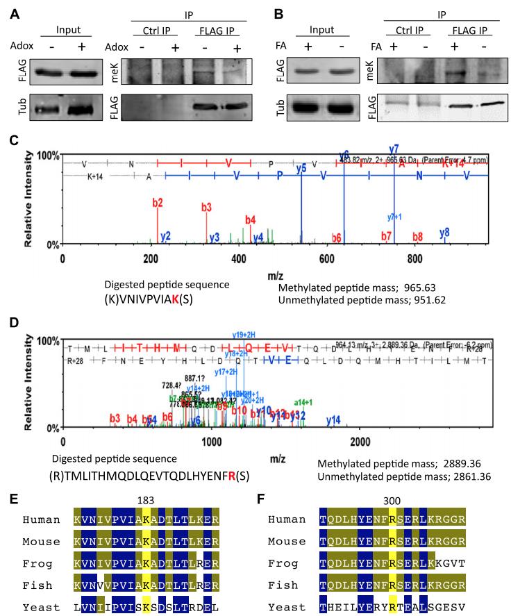 Figure 5. Human septin2 is methylated via folate pathway. A) Western blot analysis for methylated lysine (meK) and FLAG.