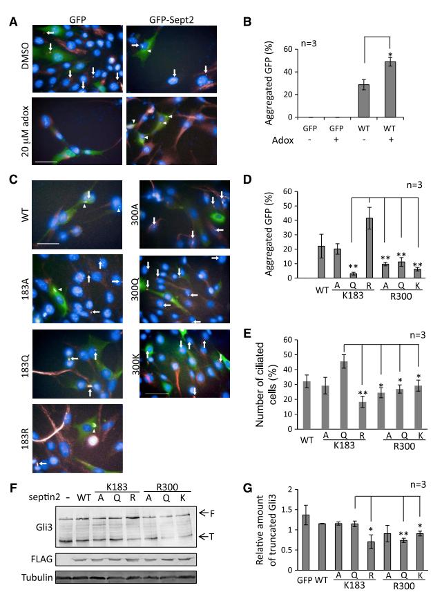 GFP-septin2. NIH3T3 cells were transfected with GFP or GFP-septin2. Two days after transfection, cells were cultured with serumstarved medium containing 20 mM adox for 16 h. DMSO was used as the control. Primary cilia were detected with anti-acetylated