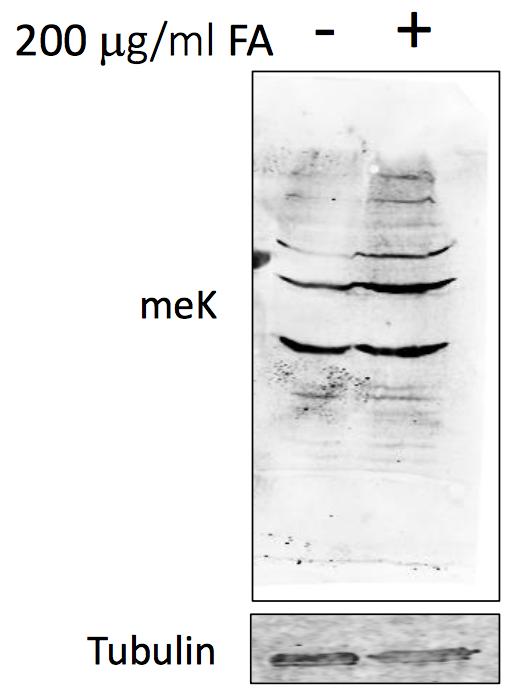 Western blotting for methylated lysine (meK) and tubulin. HEK293T cells were cultured in RPMI media containing 10% dialyzed FBS and 200 µg/ml folinic acid for 2 days.
