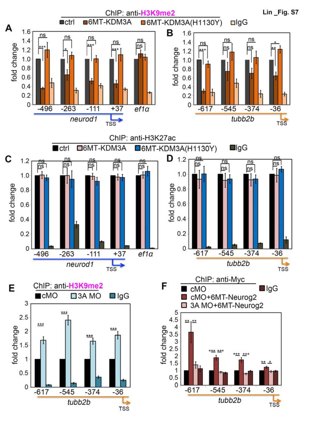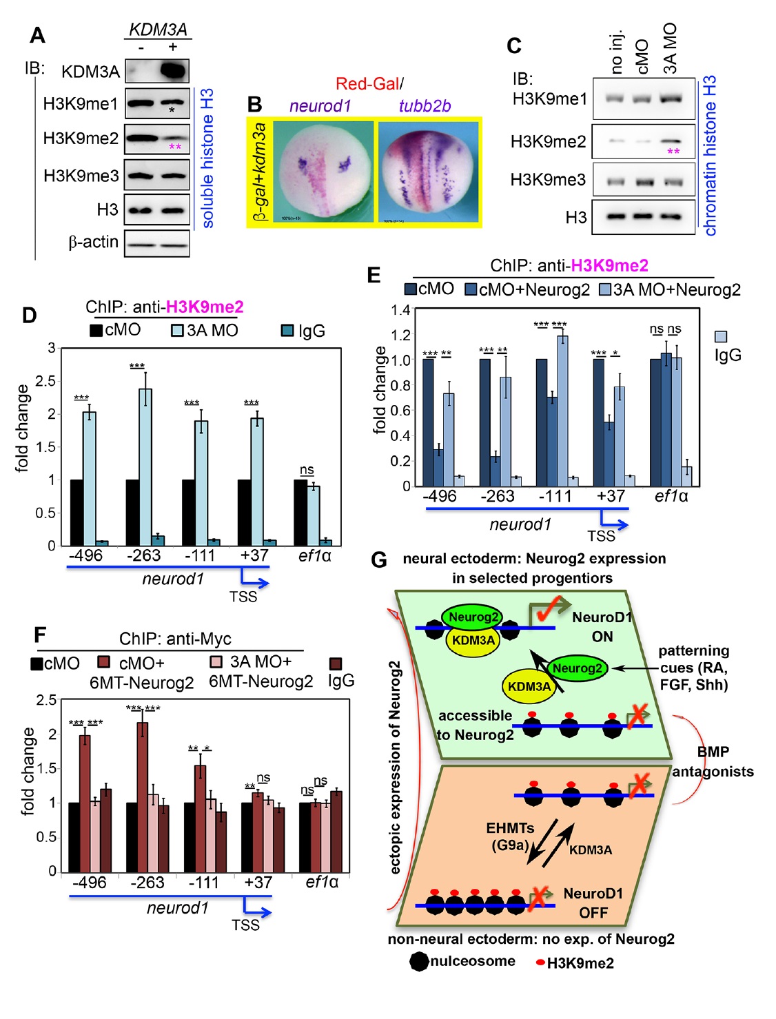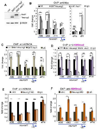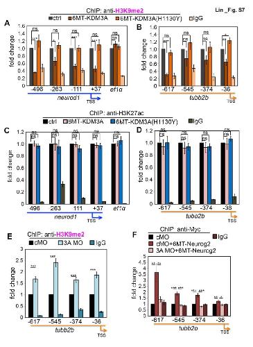 alter the H3K9me2 marks on the promoter regions of neurod1 (D) or tubb2b (E). (F)