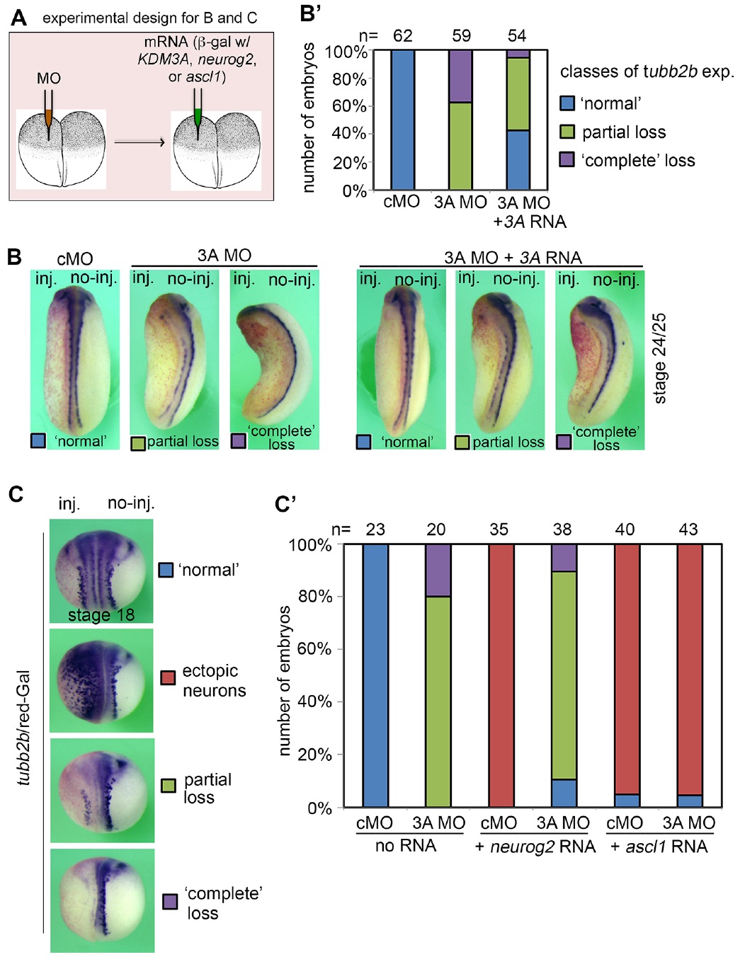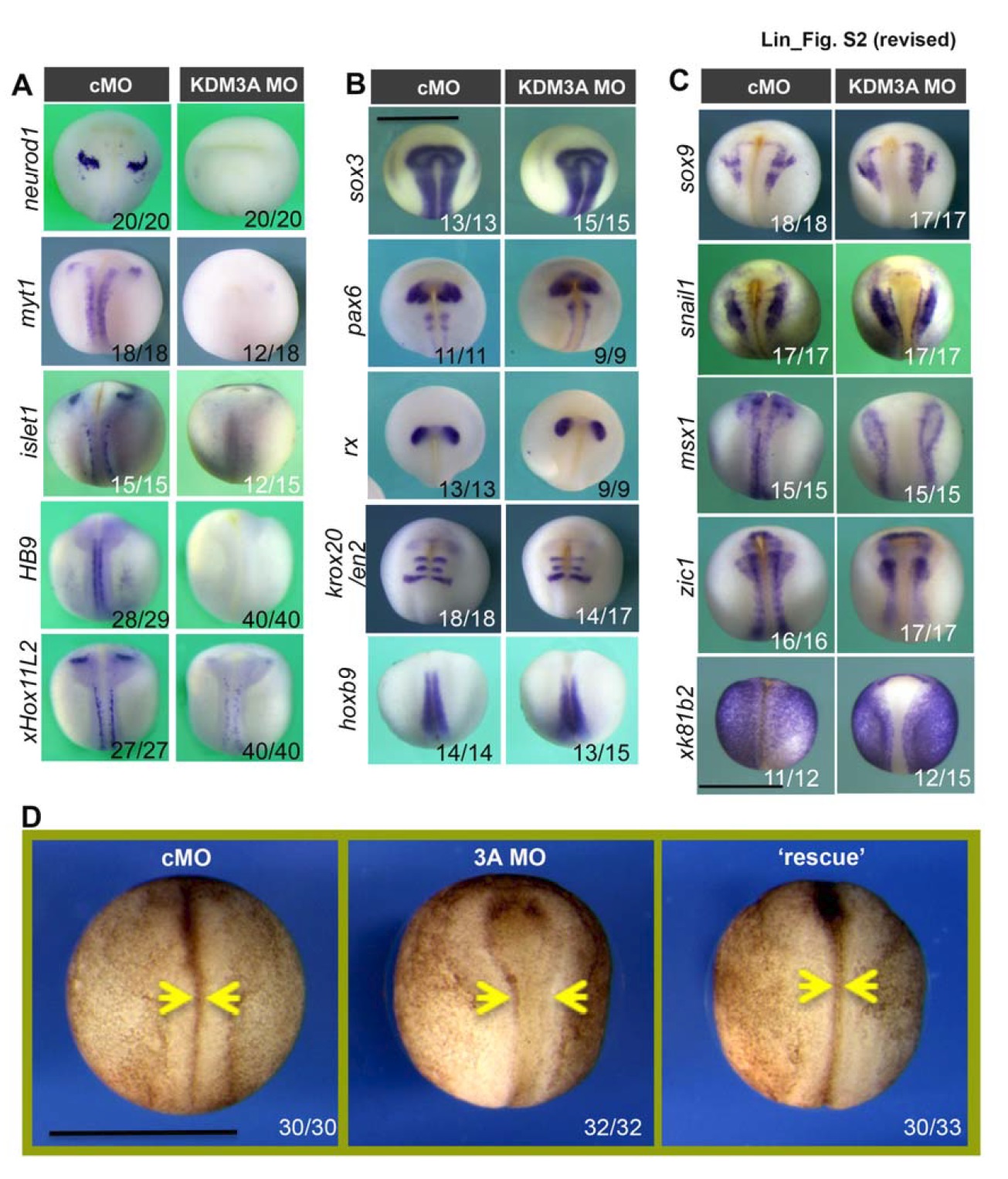(A, B, C) Control (cMO) and KDM3A morphant (3A MO) embryos at stage 18in situ