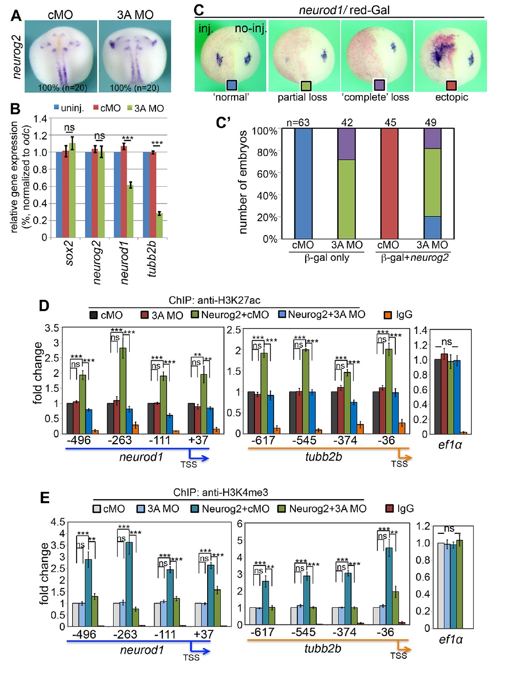 H3K27ac marks on the promoter regions of neurod1 (C) or tubb2b (D). (E)