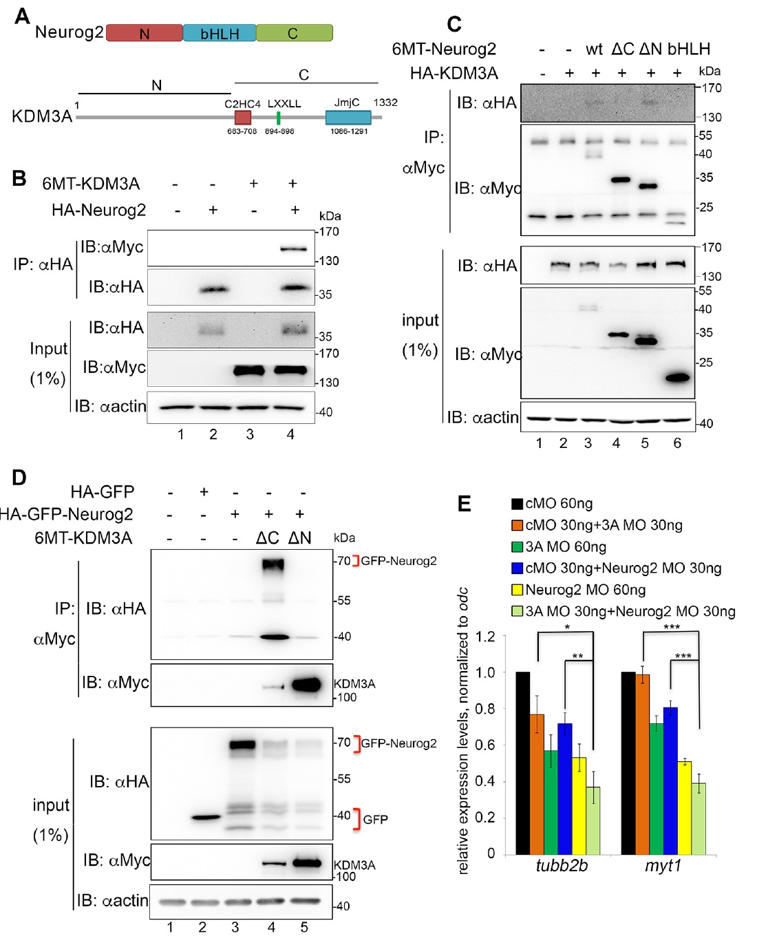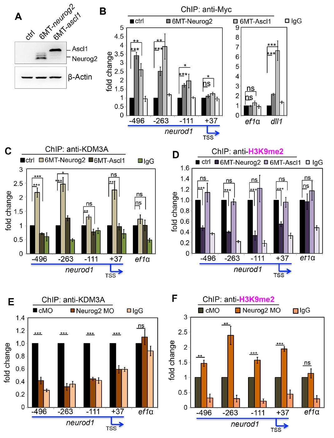 (E) Anti-KDM3A ChIP-qPCR analyses at stage 15 indicating that Neurog2 MO (80
