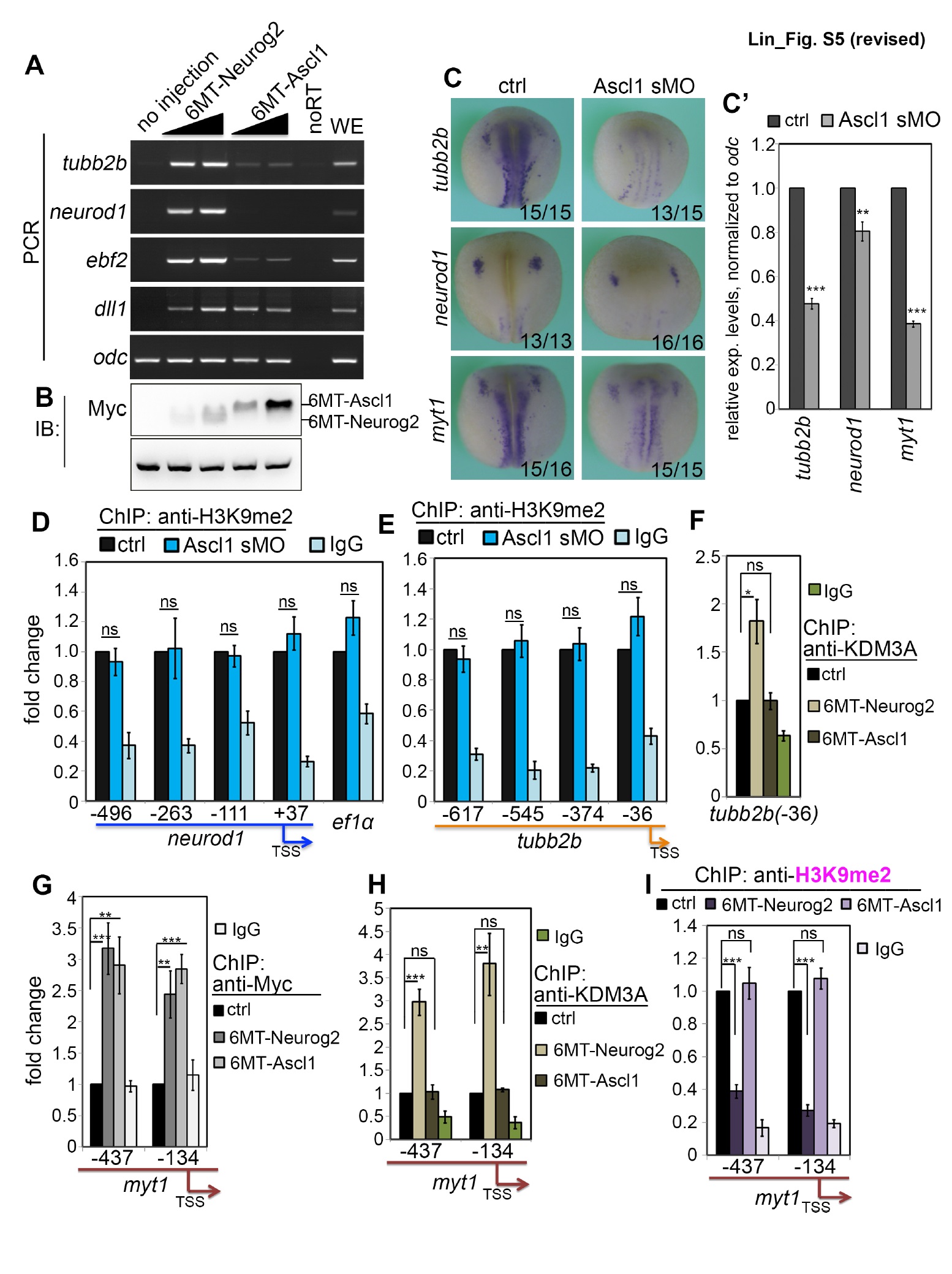 of KDM3A (H), and decreased the H3K9me2 marks (I) on the promoter of myt1. *