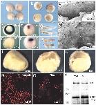 Fig. 4. Antisense morpholino oligonucleotides directed against Xcyr61 inhibit gastrulation movements but have little effect on mesodermal specification. (A,B) Morpholino oligonucleotide MO1 causes a severe retardation in blastopore closure (B) compared with control stage 12 embryos (A). (C,D) Morpholino oligonucleotide MO1 causes a decrease in Xbra expression and shifts the Xbra expression domain towards the animal pole. Embryos are at stage 11.5. (E,F) Morpholino oligonucleotide MO1 causes expansion of the goosecoid expression domain. Embryos are at stage 11.5. (G,H) Morpholino oligonucleotide MO1 (30 ng) causes shortening of the anteroposterior axis. Embryos are at stage 35. (I-K) Bisection of embryos injected with morpholino oligonucleotide MO1 reveals changes in the structure of the blastocoel roof and of the marginal zone. (I) Embryo previously injected with a control morpholino oligonucleotide at stage 11. The blastocoel roof and marginal zone are thin and compact, as indicated by the two white lines. (J,K) Morpholino oligonucleotide MO1 (30 ng) causes a thickening of the blastocoel roof and marginal zone (lines), and a separation of cell layers (arrows). (L,M) Scanning electron microscope images of a control embryo at stage 11 (L) and an embryo at the same stage previously injected with 30 ng antisense morpholino oligonucleotide MO1 (M). Note the tightly packed epithelial appearance of the cells in the blastocoel roof of the control embryo (L), and the more loosely packed appearance of cells in the MO1-injected embryo, with some cells apparently about to detach (arrows; M). Note also that the migration of the large flat mesendodermal cells visible at the bottom of (L) is impaired in MO1-injected embryos (M). (N,O) Morpholino oligonucleotide MO2 causes a decrease in fibronectin assembly in the blastocoel roof. (N) Fibronectin forms an elaborate fibrillar network in the blastocoel roof of control embryos. (O) Fibronectin assembly is reduced in the blastocoel roof of morpholino-injected embryos. (P) Western blot analysis indicates that levels of fibronectin are similar in control and morpholino-injected embryos. HSP-70 was used as a loading control. Scale bars: in L, 100 μm for L,M; in O, 100 μm for O,N.