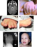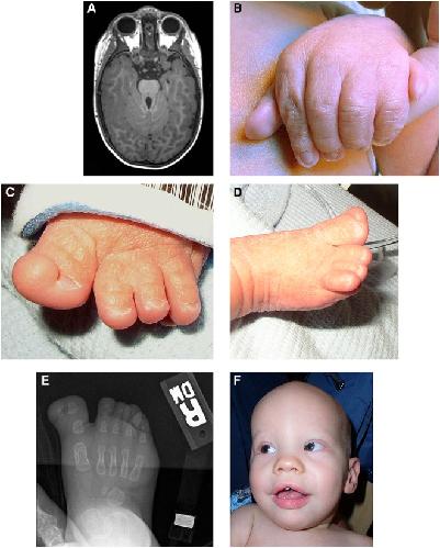 Figure 1. Patient images showing (A) (via magnetic resonance imaging) the molar tooth sign; (B) the left hand showing postaxial polydactyly and partial cutaneous syndactyly of the fourth and fifth digits; (C) the left foot showing partial duplication of the hallux and partial cutaneous syndactyly of the second and third toes; (D) the right foot showing the broad hallux and nail; (E) (via radiograph) the right foot showing the duplicated distal phalanx of the hallux; and (F) the proband as an infant showing sparse scalp hair and eyebrows, epicanthal folds, wide nasal bridge and tip, and midline notch in the upper lip.