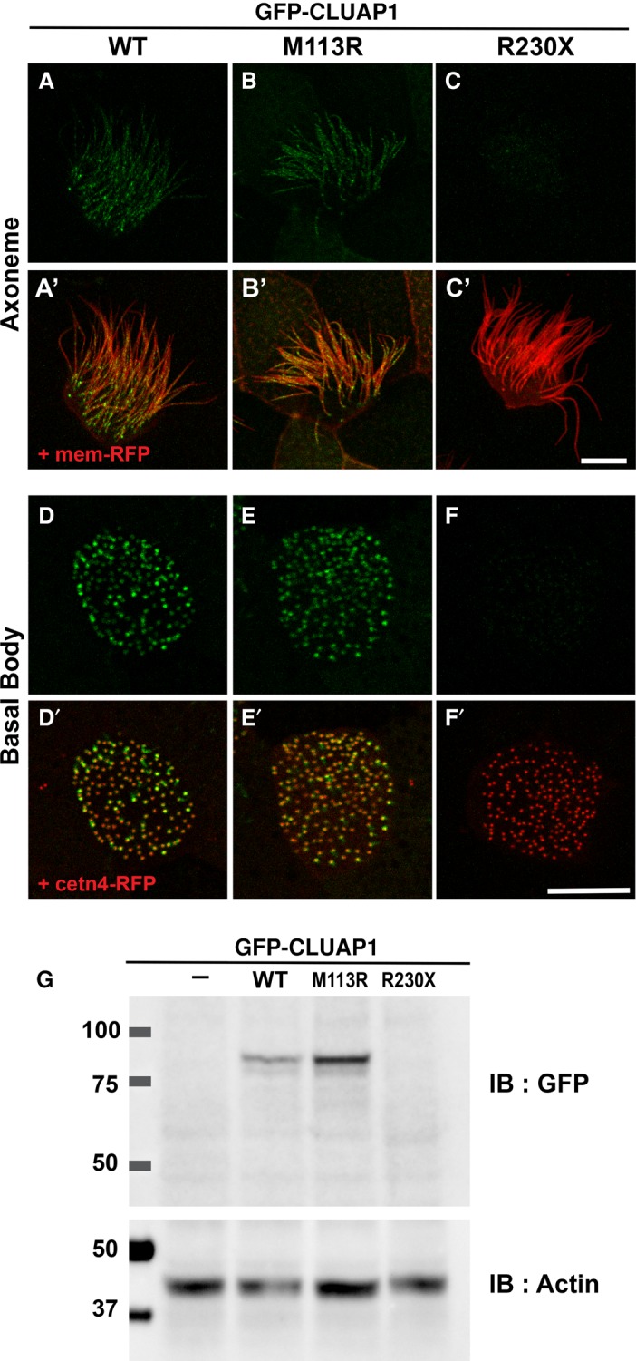 Figure 2. The CLUAP1 M113R mutant is expressed and localized normally, whereas the expression level of R230X mutants is extremely low. (A–F) Live images displaying localization of green fluorescent protein (GFP)-tagged CLUAP1 WT, M113R, and R230X proteins at the axonemes (A–C) and basal bodies (D–H) in Xenopus multiciliated cells. (A′–C′) Merge views with membrane red fluorescent protein (RFP) visualizing axonemes. (D′–F′) Merge views with cetn4-RFP, a basal body marker. Scale bars, 10 µm. (G) Western blotting of GFP-tagged CLUAP1 proteins. Actin was used as a loading control.