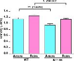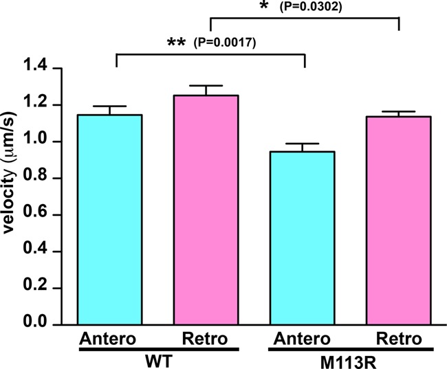 Figure 3. The CLUAP1 M113R mutant has significantly reduced intraflagellar transport (IFT) velocities. The graph shows velocities of green fluorescent protein (GFP)-tagged CLUAP1 wild type (WT) and M113R. Mean velocities ± SEM of CLUAP1 WT are 1.15 ± 0.05 µm/sec for anterograde (N = 33) and 1.25 ± 0.05 µm/sec for retrograde (N = 61). Mean velocities ± SEM of CLUAP1 M113R are 0.95 ± 0.05 µm/sec for anterograde (N = 42) and 1.14 ± 0.03 µm/sec for retrograde (N = 76). Comparing with WT, IFT velocities of M113R are significantly reduced (P value of WT vs. M113R is 0.0017 for anterograde and 0.0302 for retrograde).
