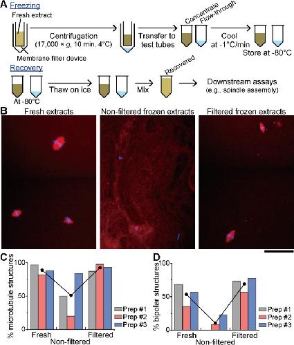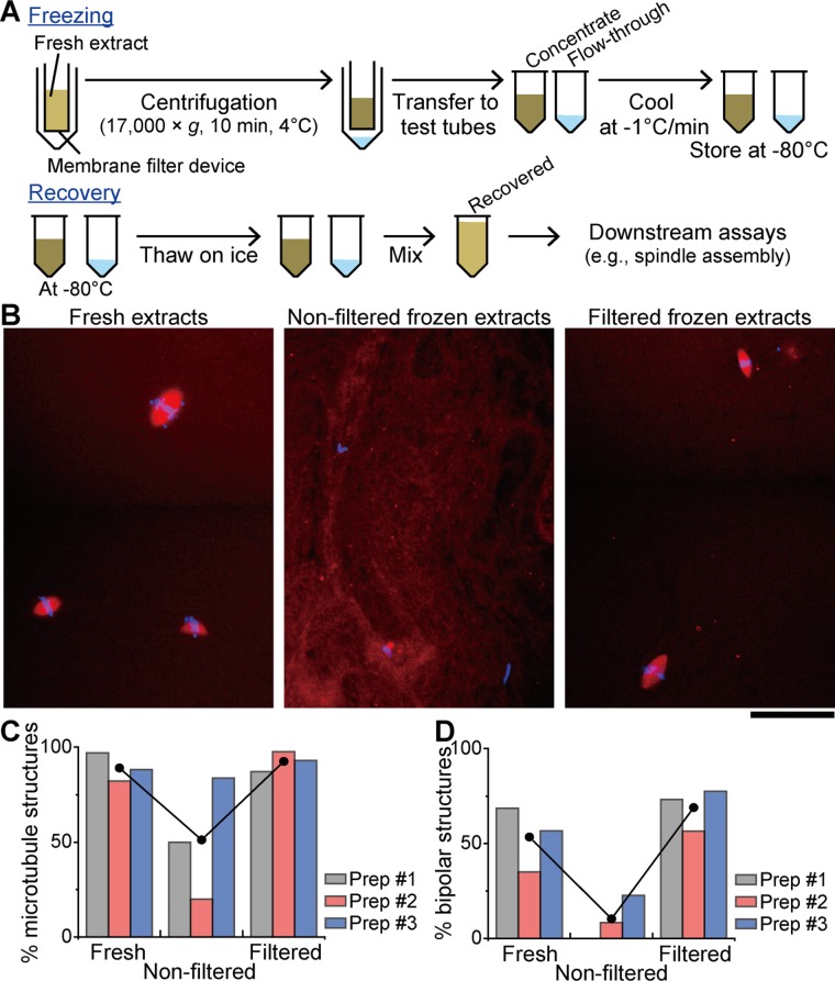 FIGURE 1:. Preparation and use of frozen Xenopus laevis egg extracts that retain spindle assembly activity. (A) Procedure for preparing frozen Xenopus egg extracts that are capable of bipolar spindle assembly. For freezing, freshly prepared extracts (yellow) are loaded into the centrifugal filter device (200 µl per device) and then spun at the indicated parameters. The resultant concentrate (dark brown) and flow-through (light blue) fractions are transferred to separate test tubes and cooled to −80°C at approximately −1°C/min. For recovery, the frozen fractions are thawed on ice and then combined. (B) Representative fluorescence images of microtubule-based structures (red: tetramethylrhodamine-tubulin, 500 nM) assembled around metaphase sperm nuclei (blue: DAPI, 1 µg/ml). Freshly prepared extracts, frozen extracts prepared without filtration, and those prepared with filtration were fixed in squashes after cycling once through interphase and back into metaphase. Scale bar: 100 μm. (C) Fraction of sperm nuclei that associated with significant microtubule assembly. Data from three independent preparations are shown (colored bars). Integrated fluorescence intensity of labeled tubulins was analyzed around each sperm nucleus in fresh extracts (n = 69, 90, and 68), nonfiltered frozen extracts (n = 64, 60, and 105), and filtered frozen extracts (n = 47, 87, and 43); those that exceeded a certain threshold were scored. (D) Fraction of microtubule-based structures that were of bipolar shape, with focused poles. The structures scored in C were analyzed to examine their bipolarity (n = 67, 74, and 60 for fresh extracts; n = 32, 12, and 88 for nonfiltered frozen extracts; n = 41, 85, and 40 for filtered frozen extracts).