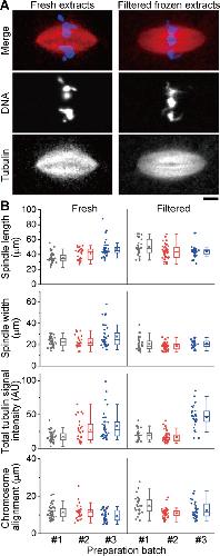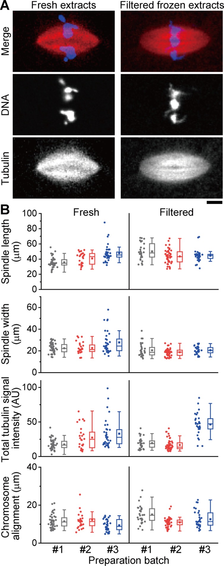 FIGURE 2:. Metaphase spindle morphology in fresh and filtered frozen extracts. (A) Representative fluorescence images of bipolar metaphase spindles (red: tetramethylrhodamine-tubulin; blue: DAPI) assembled in fresh extracts or filtered frozen extracts. Scale bar: 10 μm. (B) Distributions of spindle morphological parameters. Bipolar structures scored in Figure 1D were analyzed to determine individual spindle length, width, total tubulin signal intensity, and chromosome alignment for fresh (left columns; n = 46, 26, and 34 spindles) and filtered frozen extracts (right columns; n = 30, 48, and 31 spindles) (Supplemental Figure S1J). Data from three independent preparations are shown in colored box charts with individual plots. Within the box charts, the solid squares indicate mean values, and the horizontal lines indicate median values. The bottoms and tops of the boxes indicate first and third quartiles, respectively. Whiskers show highest and lowest values within 1.5 times the interquartile range. For statistical analysis results, see Supplemental Table S1.