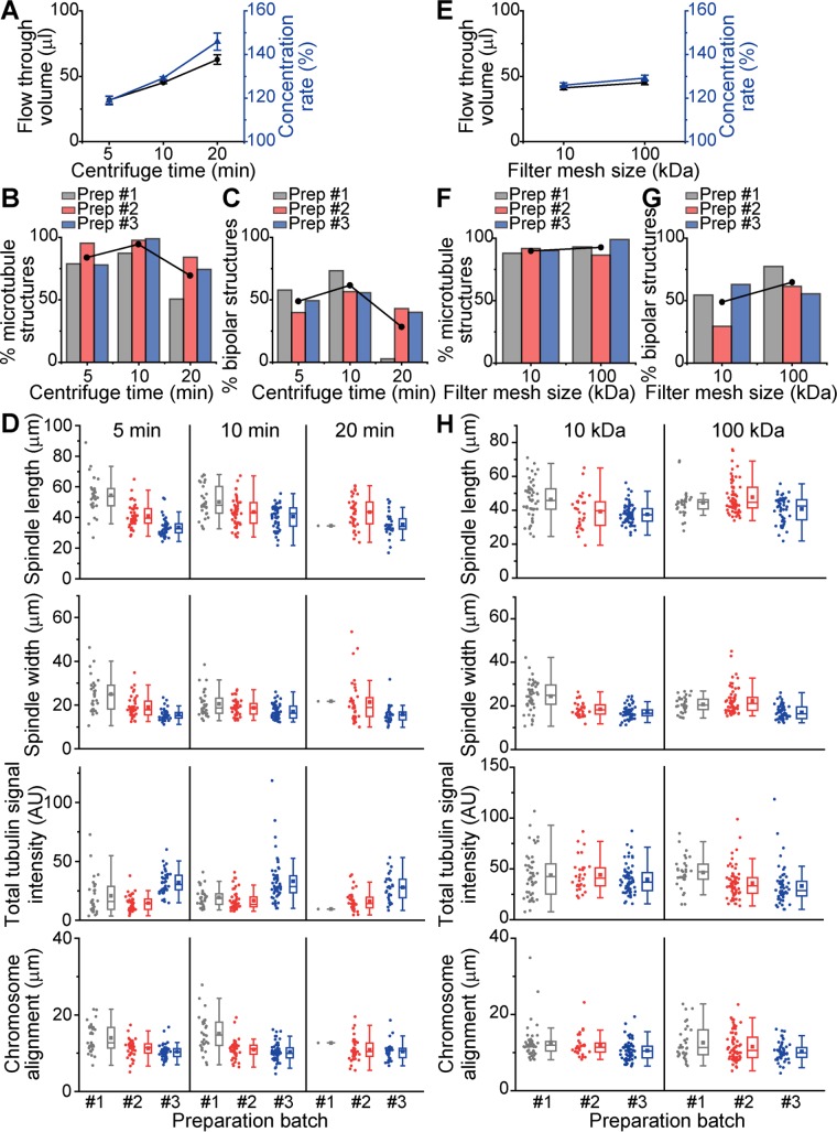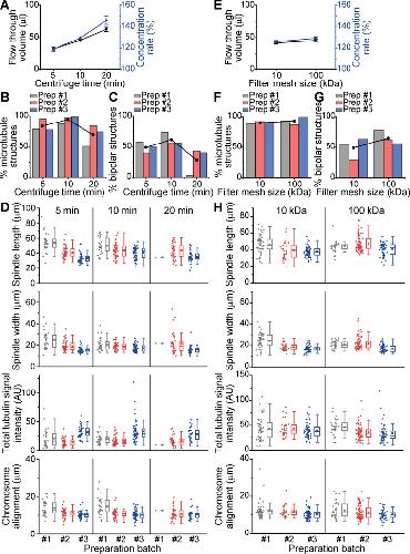 FIGURE 3:. Optimization of the frozen preparation procedure. Dependencies of the spindle assembly activity of extracts on centrifugation time (A–D) and filter mesh size (E–H). Data from three independent preparations for each condition are shown (colored bars and plots). (A, E) Concentration rate (blue triangles, as a percentage of the original extract volume) estimated from the volume of flow through (black circles, in µl) obtained with indicated centrifugation time (A) or filter mesh size (E). Plots are presented as mean ± SD (n = 3). (B, F) Fraction of sperm nuclei that were associated with significant microtubule assembly. Analysis was performed as in Figure 1C. The structures analyzed were (B) n = 66, 108, and 109 for 5-min spin; n = 47, 87, and 98 for 10-min spin; and n = 77, 100, and 101 for 20-min spin, respectively; and (F) n = 100, 111, and 111 for 10-kDa filter and n = 43, 126, and 98 for 100-kDa filter, respectively. (C, G) Fraction of microtubule-based structures that were of bipolar shape with focused poles. Analysis was performed as in Figure 1D. The structures analyzed were (C) n = 52, 103, and 85 for 5-min spin; n = 41, 85, and 97 for 10-min spin; and n = 39, 84, and 75 for 20-min spin, respectively; and (G) n = 88, 102, and 100 for 10-kDa filter; and n = 40, 109, and 97 for 100-kDa filter, respectively. Black circles in B, C, F, and G are mean values in each preparation condition. (D, H) Distributions of spindle morphology parameters. Bipolar structures scored in C (n = 30, 41, and 42 for 5-min spin; n = 30, 48, and 54 for 10-min spin; and n = 1, 36, and 30 for 20-min spin, respectively) and G (n = 48, 30, and 63 for 10-kDa filter; and n = 31, 67, and 54 for 100-kDa filter, respectively) were analyzed to determine individual spindle length, width, total tubulin signal intensity, and chromosome alignment in each preparation condition. Box chart representations are as in Figure 2B.