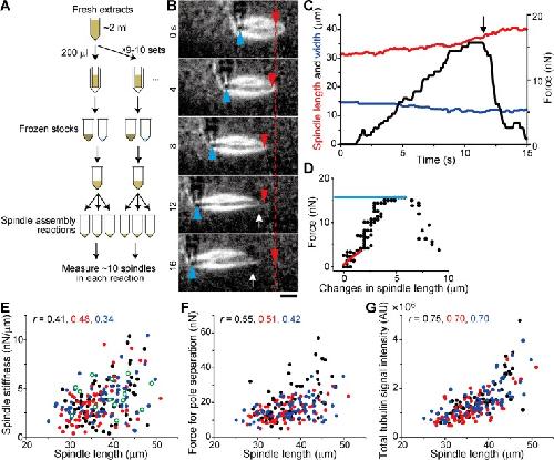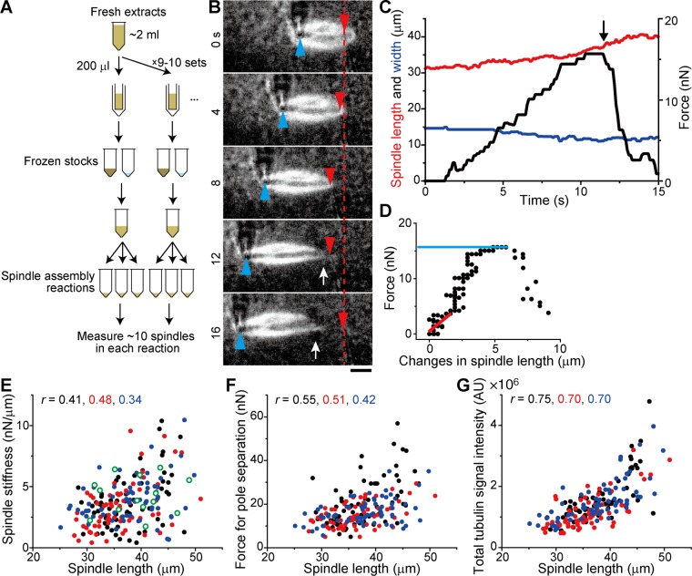 FIGURE 4:. Size-dependent mechanical properties of Xenopus extract metaphase spindles. (A) Schematic showing the procedure for the batch preparation of filtered frozen extracts used for the assay. Freshly prepared extracts >2 ml in volume are split into aliquots (200 µl each) and subjected to frozen extract preparation, as summarized in Figure 1A. Each frozen stock is thawed for recovery just before use. Data from several days of experiments performed with the same preparation batch are pooled and analyzed. The typical number of measurements acquired per each spindle assembly reaction is â¼10. (B) Time-lapse images of a bipolar metaphase spindle assembled in filtered frozen extracts and stretched by a dual microneedle-based setup. Confocal fluorescence (tetramethylrhodamine-labeled tubulin, 500 nM) and bright-field images acquired simultaneously during the time-lapse are overlaid (time stamp: in seconds). In the images, the manipulation microneedle tip (marked in blue) was moved at 2 µm/s. Tension that developed across the spindle was monitored based on the displacement of the force-sensing flexible microneedle tip (marked in red, stiffness: 1.9 nN/μm) from its equilibrium (dashed line). White arrows highlight disorganization and breakage of the spindle pole. Scale bar: 10 μm. (C) Changes in spindle length (red), width (blue), and magnitude of force (black) analyzed in B over time. The black arrow indicates the time at which the spindle pole was split apart. (D) Force-extension plots. Changes in spindle length during the time course in C are plotted against the magnitude of developed force. Linear regression was performed within a 5% extension range (red solid line) to determine the stiffness of the entire spindle structure. Plateau of the force-extension plot (blue solid line) was used to determine the pole-splitting force. (E, F) Dependencies of spindle stiffness (E) and pole-splitting force (F) on spindle size. A total of n = 65, 66, and 67 spindles were examined in three independent preparations (black, red, and blue solid circles, respectively) and plotted against each spindle length measured before microneedle insertion. Green open circles in E are data obtained in fresh extracts (n = 14 spindles from five independent preparations) (Takagi et al., 2014). (G) Dependencies of spindle microtubule amount on spindle size. Integrated fluorescence signal intensity of dye-labeled tubulin within each spindle was analyzed for the data set in E and F. The tubulin images acquired before micromanipulation procedure were used for analysis. Top left r values in EâG are Pearson correlation coefficients analyzed for each data set.