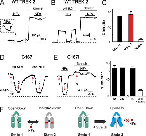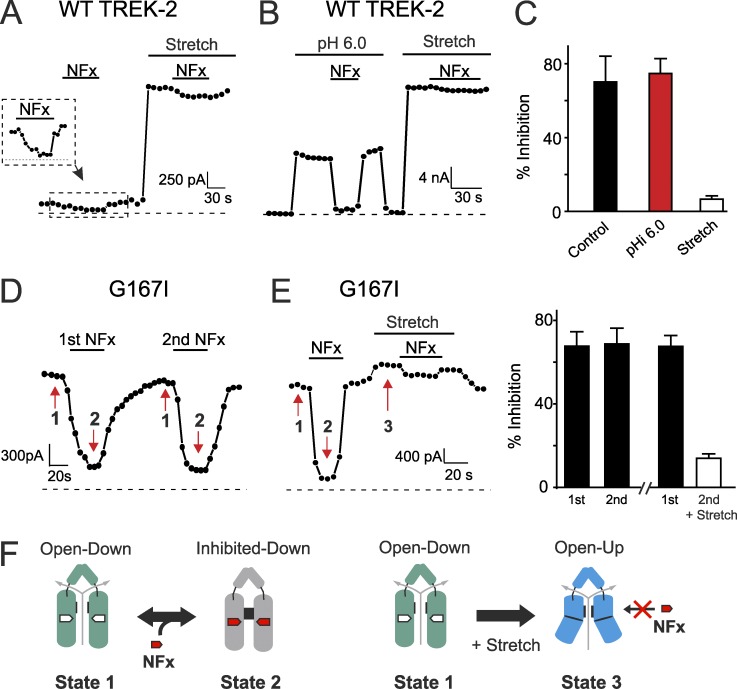 Figure 2. Dynamic interconversion between structurally distinct open conformations. (A) Example showing WT TREK-2 currents from an inside-out patch; at pHi 7.4, channels can be inhibited by 10 µM NFx (effect magnified within inset dashed box). Channels were then stretch activated by application of negative pressure (−11 mmHg suction to the pipette), whereupon NFx inhibition is markedly reduced. Currents were recorded from voltage steps to 0 mV from a holding potential of −80 mV. The dashed line indicates the zero current level. (B) Similar dynamic changes in NFx inhibition can also be observed for channels activated by intracellular acidification (pHi 6.0), demonstrating that these two activated states are structurally distinct. (C) Summary of dynamic changes in NFx inhibition seen for stretch activation but not pHi activation. (D) Repeated NFx application produces consistent inhibition of the G167I mutant channel. The red arrows indicate distinct structural states of the channel. (E) Example experiment (similar to that shown in A and B) showing a dynamic change in NFx inhibition for the G167I mutant as the channel is converted from the down state to the up by membrane stretch. (C and E) Error bars shown are mean ± SEM (n ≥ 6). (F) Cartoon illustrating conversion between different structural states of the channel. The numbers refer to states shown by the red arrows in D. (left) The G167I mutation directly activates the filter gate in the down state, and the NFx-binding site remains available, but when the same channel is subjected to membrane stretch (right), it is converted into the up state, which exhibits reduced NFx sensitivity as the result of closure of the fenestration binding site.