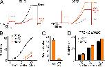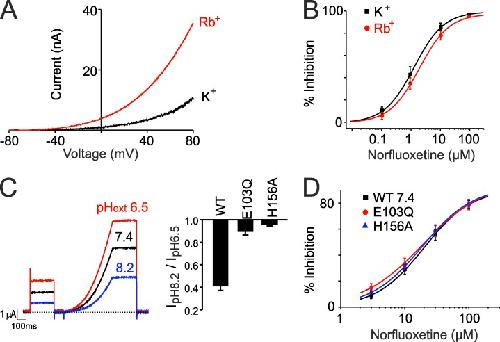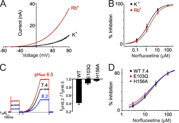 Figure 3. Direct activation of the filter gate without major conformational changes. (A) Example traces from inside-out patches showing activation of TREK-2 currents upon exchange of intracellular K+ for Rb+. (B) Summary dose–response curves showing NFx inhibition of TREK-2 does not change when Rb+ is used as the permeant ion to directly activate the filter gate. (C) Example showing activation of whole-cell currents upon extracellular acidification. Bar chart shows the effect of the H156A and E103Q mutations that abolish pHext activation by interfering with the filter gating mechanism (Dong et al., 2015). (D) Dose–response curves from two-electrode voltage clamp recordings of whole-cell currents showing that neither mutation reduces NFx inhibition (WT IC50 = 23.4 ± 3.9 µM, n = 10; E103Q IC50 = 18.3 ± 2.3 µM, n = 7; H156A IC50 19.1 ± 2.1 µM, n = 11). Note that when applied extracellularly, higher concentrations of NFx are required to inhibit channel activity. (B–D) Error bars shown are mean ± SEM (n ≥ 6).