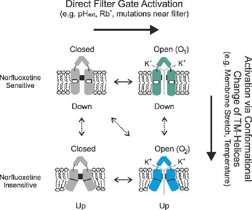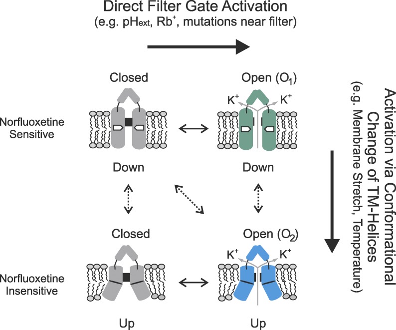 Figure 5. Expanded gating model for TREK-2 activation. This cartoon illustrates how structurally distinct open states (e.g., O1 and O2) can be produced by different activatory stimuli. The model allows for the filter to gate independently in both the up and down conformations. The dotted line illustrates how the major conformational changes in the TM helices caused by, e.g., membrane stretch and temperature can also influence the filter gating mechanism. The model also shows how the channel can interconvert between different open states in response to membrane stretch.