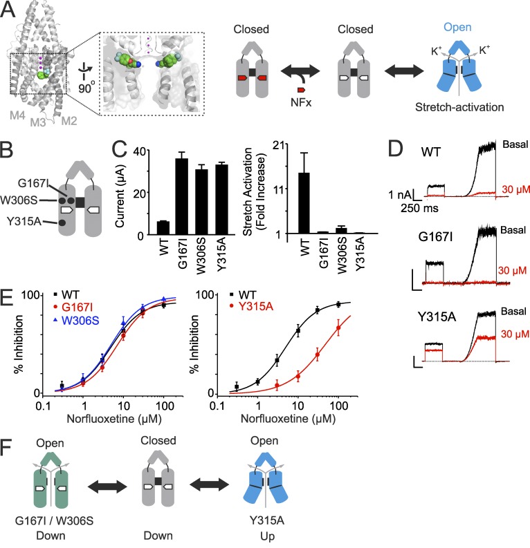 Figure 1. The down state can be conductive. (A, left) Structure of TREK-2 in the down state showing NFx (as colored spheres) bound within the fenestrations (Dong et al., 2015). K+ ions within the filter are shown in magenta. (right) Cartoon model illustrating how activation by membrane stretch reduces inhibition by NFx (red pentagon). In the unbound down state (middle), the filter gate is closed. The NFx-binding site is only found in the down state; thus, channel activation by membrane stretch (up state, blue) reduces availability of the NFx-binding site. This binary two-state model of gating assumes the down state is always closed and the up state is always open. (B) Relative position of the filter gate mutations (G167I and W306S) that directly activate TREK-2 and the Y315A mutation in TM4, which affects movement between the down and up states. (C) All three mutations produce similar increases in basal whole-cell currents recorded at 100 mV (n ≥ 20; left) and similar reductions in fold activation by membrane stretch (right); currents were recorded in inside-out patches at 0 mV before and after application of negative pressure. Error bars shown are mean ± SEM (n = 5). (D) Example traces showing inhibition by 30 µM NFx inhibition for WT and mutant channels. The voltage protocol involves a step to 0 mV from a holding potential of −80 mV, followed by a ramp from −100 to 60 mV. (E) Dose–response curves showing NFx inhibition is unaffected by the filter gate mutations (G167I and W306S) but reduced by the Y315A mutation. WT IC50 4.9 ± 0.5 µM, n = 16 compared with G167I (IC50 7.0 ± 0.6 µM, n = 10), W306S (IC50 5.0 ± 0.4 µM, n = 10), and Y315A (IC50 > 30 µM, n = 8). Error bars shown are mean ± SEM (n ≥ 6). (F) Revised gating model showing that channels activated by the filter gate mutations are in the down state, whereas activation by the Y315A mutation affects movement between states to reduce NFx inhibition.