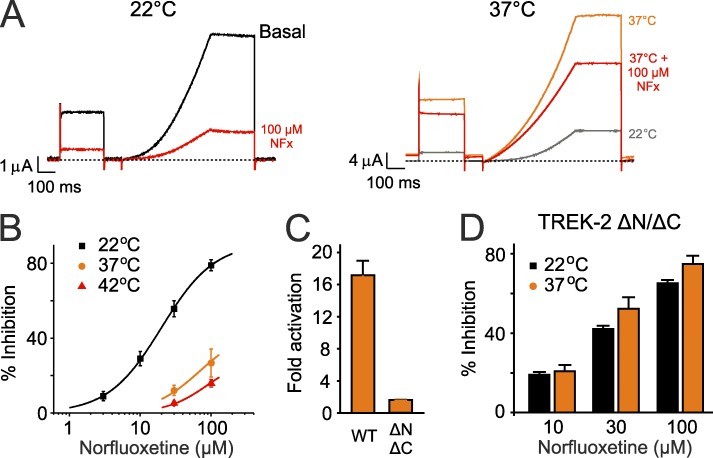 Figure 4. Temperature activation involves conformational changes in the TM helices. (A) Example traces showing that temperature-dependent activation of whole-cell TREK-2 currents from 22°C (left) to 37°C (right) markedly decreases inhibition by 100 µM NFx. For comparison, the currents at 22°C are also shown in gray in the right panel. Currents were recorded by voltage protocols similar to those used in Fig. 1 D. (B) Summary dose–response curves showing reduced NFx sensitivity of whole-cell TREK-2 currents at 22°C, 37°C, and 42°C (data shown are percent inhibition of basal currents recorded at 0 mV; mean ± SEM, n ≥ 6). IC50 at 22°C, 23.4 ± 3.1 µM; but at 37°C and 42°C, >100 µM. (C) A truncated version of TREK-2 (TREK2 ΔN/ΔC) that no longer responds to temperature. Fold activation represents change in current between 22°C and 37°C. (D) The NFx sensitivity of this temperature-insensitive mutant is unaffected by temperature, indicating a specific effect on WT TREK-2. (C and D) Error bars shown are mean ± SEM (n ≥ 6).