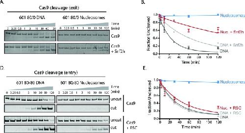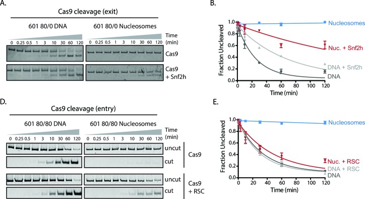 http://dx.doi.org/10.7554/eLife.13450.039Figure 3—figure supplement 1. Cas9 cleavage assays with SNF2h and RSC chromatin remodelers.(A) Representative gel images of Cas9 cleavage experiments with 601 80/0 asymmetric particles and SNF2h chromatin remodeler, including DNA control experiments. Cas9 was loaded with sgRNA targeting the exit site of the nucleosome. SNF2h re-centers asymmetric nucleosomes such as 80/0 (Figure 3—figure supplement 3), exposing the Cas9 target site. (B) Quantification of (A). (C) Representative gel images of Cas9 cleavage experiments with 601 80/80 symmetric nucleosomes and RSC chromatin remodeler, including DNA control experiments. Cas9 was targeted to the entry site of the nucleosome. RSC destabilizes nucleosomal structure and repositions nucleosomes to the ends of the DNA molecule. (D) Quantification of (C). Represented values are mean ± SEM from three replicates.DOI: