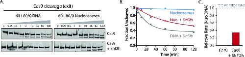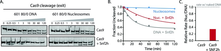 Figure 3—figure supplement 2. Simultaneous chromatin remodeling and Cas9 cleavage of nucleosomal substrates.(A) Assay comparing Cas9 cleavage of 601 80/0 nucleosomes simultaneously with chromatin remodeling byr SNF2h. The 601 80/0 asymmetric nucleosomes are recentered by SNF2h, exposing the exit target site to Cas9 (B) Quantification of (A). (C) Cleavage rates of 80/0 nucleosomes by Cas9 relative to naked DNA, in the presence or absence of SNF2h. SNF2h improves Cas9 cleavage to ~40% of the naked DNA cleavage rate, similarly to sequential remodeling and cleavage assays shown in Figure 3A–D. Results shown for single experiment performed.DOI: