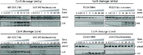 http://dx.doi.org/10.7554/eLife.13450.023Figure 2—source data 3. Replicate gels of cleavage of 0/0 5S DNA and nucleosomes with sgRNA entry.DOI: