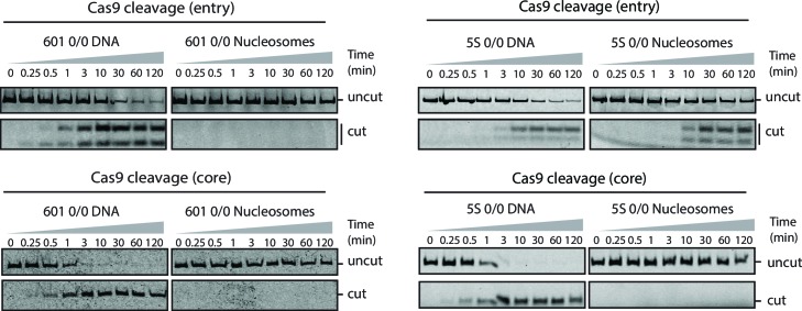 http://dx.doi.org/10.7554/eLife.13450.029Figure 2—figure supplement 1. Cas9 cleavage assay with 601 and 5S 0/0 nucleosomes.Representative gel images of Cas9 cleavage experiments with 601 (left) and 5S (right) 0/0 particles using sgRNAs targeting entry (top) or core (bottom) sites, including DNA control experiments. Samples were resolved on 12% (entry) or 8% (core) polyacrylamide gels. Cleavage with sgRNAs targeting the entry site on both 5S and 601 substrates generates a short cleavage product (13 bp) which partially denatures and runs as two bands (single and double stranded) on 12% polyacrylamide gels.DOI: