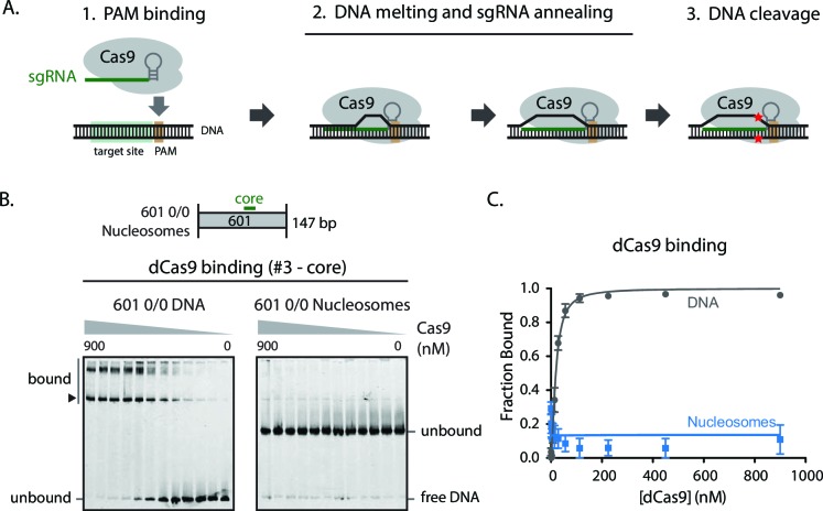 http://dx.doi.org/10.7554/eLife.13450.015Figure 1—figure supplement 1. Nucleosome positioning blocks Cas9 from binding PAM sites on DNA.(A) Schematic illustrating the stepwise mechanism of Cas9 binding to DNA targets and subsequent nucleolytic cleavage. (B) Gel shift assay comparing dCas9 binding to 0/0 DNA and nucleosomes while loaded with sgRNA #3 targeting the nucleosome dyad. Band shift pattern appears as discrete lower band (dCas9 bound to sgRNA-specified target, arrowhead) and higher, super shift bands (additional dCas9 PAM-only binding events). (C) Quantification of (B). Represented values are mean ± SEM from three replicates.DOI: