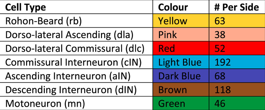 Figure 11. Fasciculation reduces mid-cycle dIN firing. (A) Simulation of a connectome with approximately 45,000 synapses and no fasciculation. A large number of dINs fire mid-cycle spikes at approximately the same time as neurons on the contralateral side of the body are active. Colour code as given in Table 1. (B) Reducing the number of synapses increases the number of dINs that fire mid-cycle spikes. For a given number of synapses, connectomes generated with fasciculation (s=0.2,r=1)