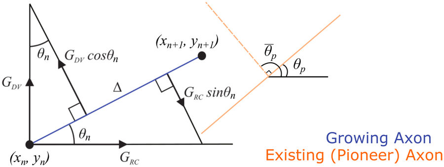 Figure 2. Schematic representation of the fasciculation/repulsion mechanism in the model. The solid orange line shows the direction of growth for the closest pioneer axon. This orange line is used to adjust the current growth angle of the follower axon shown by blue solid line. In case of fasciculation the current growth angle becomes closer to the growth angle of the pioneer axon. In case of repulsion the perpendicular dashed orange line is used to adjust the axon growth angle of the follower axon.