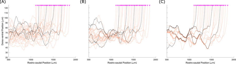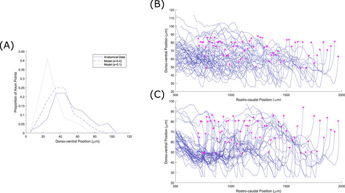 Figure 9. The effect of fasciculation on aIN axon trajectories. (A) Histogram comparing the dorso-ventral distribution of axons in the anatomical data used for optimization (solid line), optimized model output without fasciculation (dashed line) and model output with fasciculation sensitivity 0.1 (dotted line). (B,C) Example generated primary aIN axons for the s = 0 and s = 0.1 cases respectively. Magenta stars show positions where the axons begin growing.