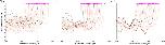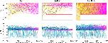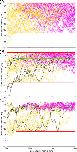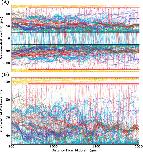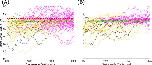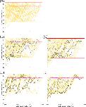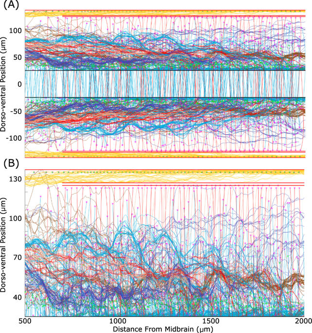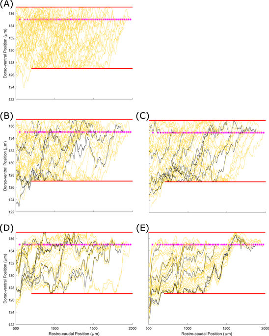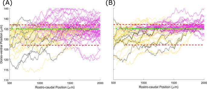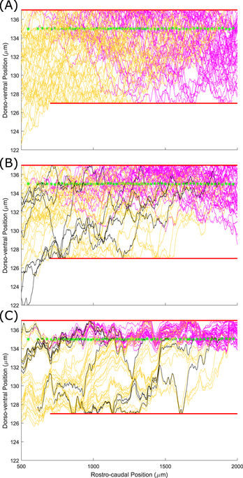 Figure 8. Fasciculation helps to constrain sensory axons to the dorsal tract when normal growth barriers do not perfectly block axon growth. Barriers (red lines) have 25 µm gaps at 25 µm intervals. Yellow lines show primary axons, magenta lines show secondary, black lines are pioneer primary axons. (A) With no fasciculation 24% of axon points are outside the marginal zone. (B) With fasciculation (s=0.2,r=1) 15% of axon points are outside the marginal zone.