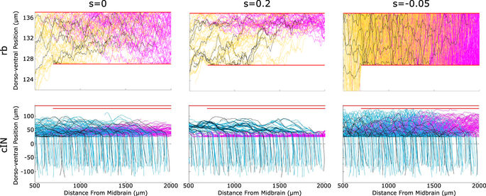 Figure 7. Patterns of axon growth for different neuron types with attraction, repulsion or neither. The left column shows axon patterns for RB (top) and cIN (bottom) cell types without fasciculation. The middle column shows axon patterns for the same cell types with fasciculation (sensitivity 0.2). The right column shows axon patterns for the same cell types in the case of repulsion (sensitivity −0.05). Primary axons are coloured according to Table 1, secondary axons are magenta and pioneer primary axons are black. Red horizontal lines indicate the boundaries of the marginal zone, and the dashed horizontal line in the bottom row corresponds to the ventral midline. cIN axons start on one side, cross the midline and then turn to grow longitudinally. Note that the horizontal scale is identical in all parts.