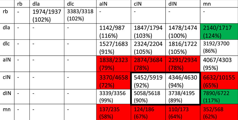 Table 2: Number of synaptic connections (rounded average across 12 connectomes for each case) between different cell types on both sides, with and without fasciculation (first and second numbers respectively), as well as the percent change in synapse count that results from fasciculation. Each row gives the number of connections made by neurons of a particular type (first column) onto neurons of every other type. Dashes indicate pairs where there is a negligible number of connections (<50) in both cases. Green and red highlights show pairs with particularly large increases and decreases (respectively) in synapse counts. The core CPG network (dINs and cINs) is highlighted with a bold border.