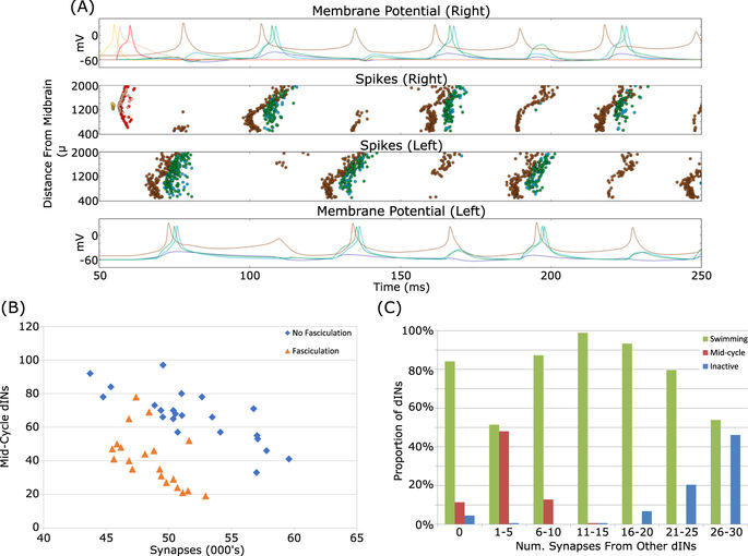 have fewer mid-cycle dINs. (C) A dIN’s spiking pattern depends on how many synapses it receives from other dINs. Neurons that receive little excitation (but not none) have a roughly 50% chance of firing mid-cycle spikes. Inactive dINs tend to receive a lot of excitatory input, but are unable to spike due to depolarisation blockade. Data from four connectomes with fasciculation and probability reduced to give approximately 50,000 synapses.