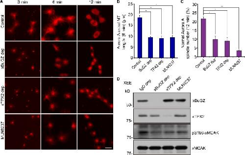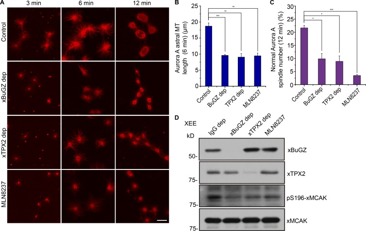Figure 2. BuGZ contributes to MT assembly and reduces S196 phosphorylated xMCAK. (A) MT asters and spindles assemble around AurA beads at the indicated time points in mock-depleted XEEs or XEEs depleted (dep) of xBuGZ or xTPX2 or treated with MLN8237. Bar, 10 µm. (B and C) MT aster lengths (B) and percentages of bipolar spindles (C) were quantified. Approximately 50 (B) and ∼200 (C) AurA bead structures were quantified in three independent experiments. (D) XEE mock-depleted by unimmunized rabbit IgG, xBuGZ, or xTPX2 antibodies or treated with MLN8237 were analyzed by Western blotting probing with the indicated antibodies. The means and SEM are graphed. Student’s t test: *, P < 0.05; **, P < 0.01; ***, P < 0.001.