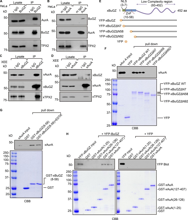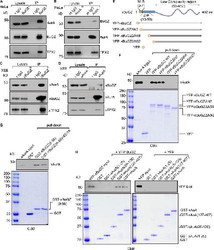 Figure 3. The zinc fingers of BuGZ directly bind to the kinase domain of AurA. (A and B) Immunoprecipitation (IP) using BuGZ (A) or AurA (B) antibodies in mitotic HeLa cell lysates. Equivalent of 1% of the input lysate and 20% of total immunoprecipitates were loaded. (C and D) Immunoprecipitation using xBuGZ (rabbit polyclonal IgG; r IgG; C) or xAurA (mouse polyclonal IgG; m IgG; D) antibodies in XEEs. Equivalent of 0.2% of the input lysate and 30% of total immunoprecipitates were loaded. (E) Schematic of xBuGZ with NLS, zinc fingers (ZnFs), and the C-terminal region as well as YFP-tagged xBuGZ used in the study. (F) Purified YFP, YFP-xBuGZ, YFP-xBuGZΔ7, YFP-xBuGZΔN58, or YFP-xBuGZΔN92 were incubated with purified xAurA, followed by pulldown with antibody to YFP and then Western blotting and Coomassie Brilliant blue (CBB) staining. (G) Purified GST or GST-xBuGZ(8–58) was incubated with purified xAurA in the presence or absence of EDTA followed by GST pulldown, Western blotting, and Coomassie blue staining. (H) Purified GST, GST-xAurA, GST-xAurA(1–25), GST-xAurA(26–126), or GST-xAurA(127–407) were incubated with YFP or YFP-xBuGZ followed by GST pulldown, Western blotting, and Coomassie blue staining. For G and H, 0.1% of total reaction and 10% of total xBuGZ pulldowns were analyzed by Western blotting. 1% of total reaction and 10% of total pulldowns were analyzed by Coomassie blue staining.
