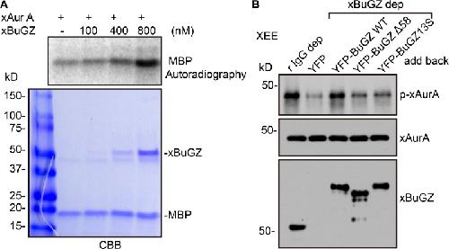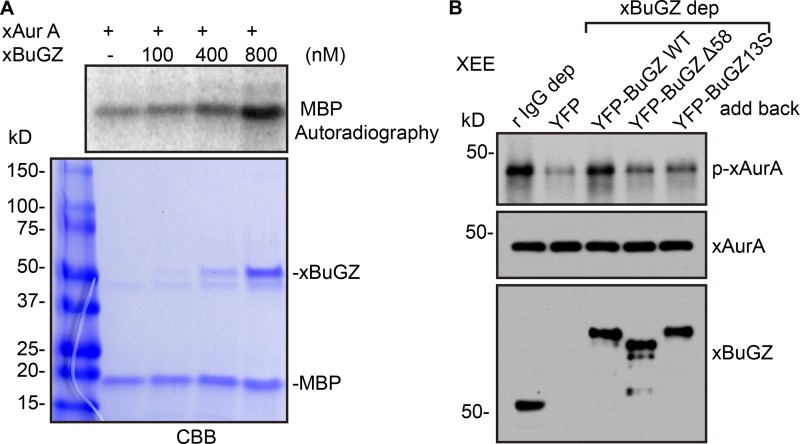Figure 5. Effects of BuGZ phase transition and binding to AurA on kinase activity. (A) Purified xAurA (cleaved from mCherry-xAurA) was incubated from purified xBuGZ (cleaved from YFP-xBuGZ) and MBP to assay AurA kinase activity in vitro. CBB, Coomassie Brilliant blue. (B) XEE was mock depleted or depleted (dep) with BuGZ antibody, and the BuGZ-depleted XEE was supplemented with the indicated purified proteins followed by xAurA immunoprecipitation and Western blotting analyses. r IgG, rabbit polyclonal IgG.