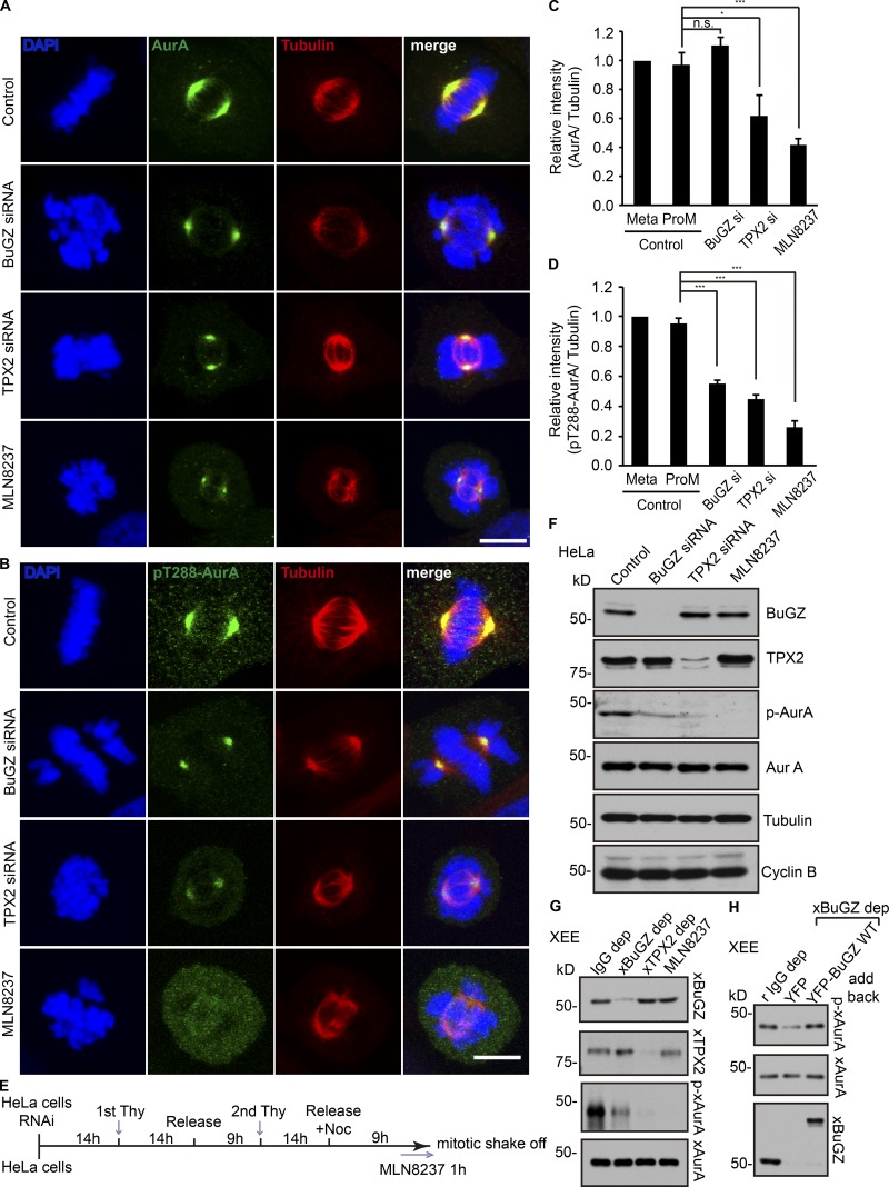 Figure 1. Effects of BuGZ on AurA kinase activity in mitosis. (A–D) Cells were transfected with control, BuGZ, or TPX2 siRNA (si) or were treated with AurA inhibitor MLN8237 (100 nM) followed by staining with antibodies to total AurA (A) or p-AurA (B). Bars, 10 µm. The immunostaining intensity of total AurA (C) and p-AurA (D) in control siRNA–treated cells in metaphase or prometaphase (ProM, containing misaligned chromosomes or thick chromosome bars) and cells in the experimental groups containing misaligned chromosomes were quantified. 75–152 total cells from three independent experiments in each experiment were measured and quantified. Error bars indicate SEM. One-way ANOVA: *, P < 0.05; ***, P < 0.001. (E) Scheme of cell synchronization and mitotic shakeoff. (F) Cells transfected with siRNA were synchronized, collected, and analyzed by Western blotting with indicated antibodies. (G) XEEs were depleted (dep) with unimmunized rabbit IgG (IgG), xBuGZ, or xTPX2 antibodies or were treated with MLN8237. xAurA was immunoprecipitated and analyzed by Western blotting using indicated antibodies. (H) XEEs were depleted of xBuGZ and supplemented by purified YFP or YFP-xBuGZ followed by AurA immunoprecipitation and Western blotting. Noc, nocodazole; Thy, thymidine.